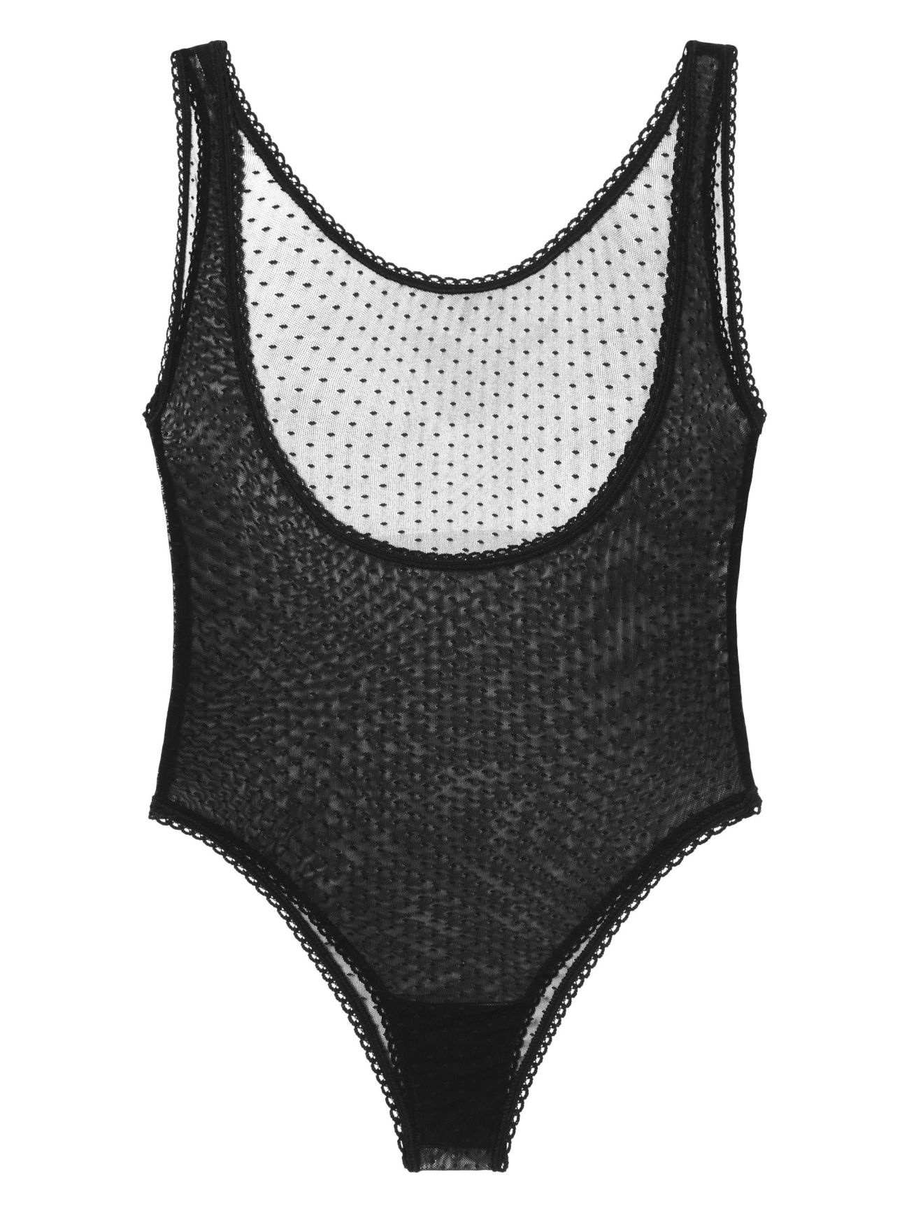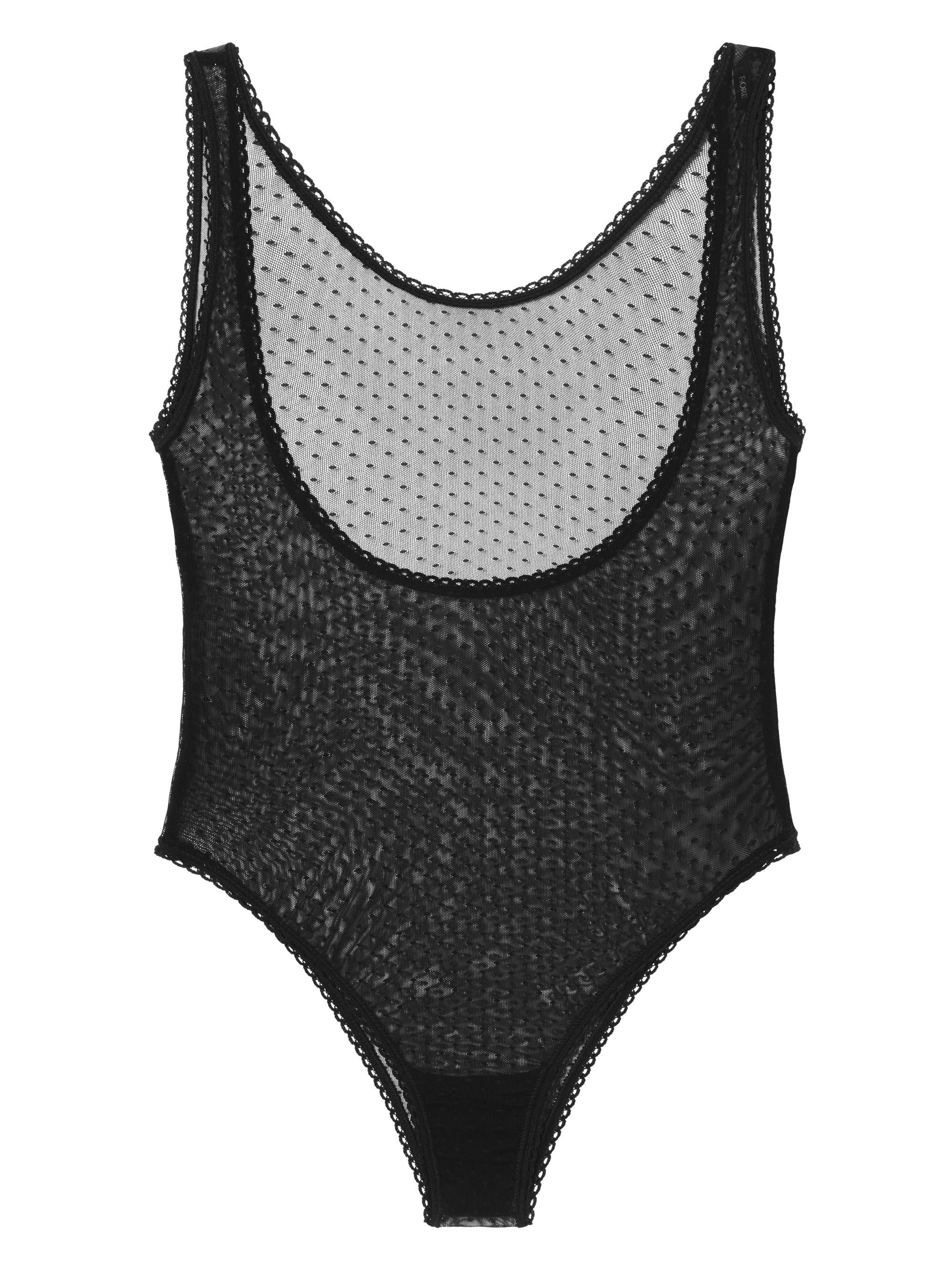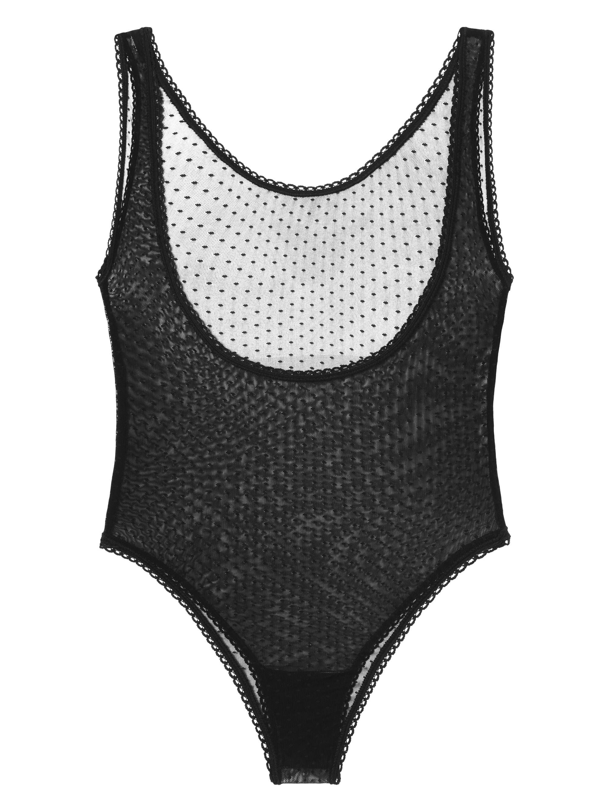 Sensual, transparent, polka dot bodysuit. A deeper back neckline adorned with hem, along with wide straps.