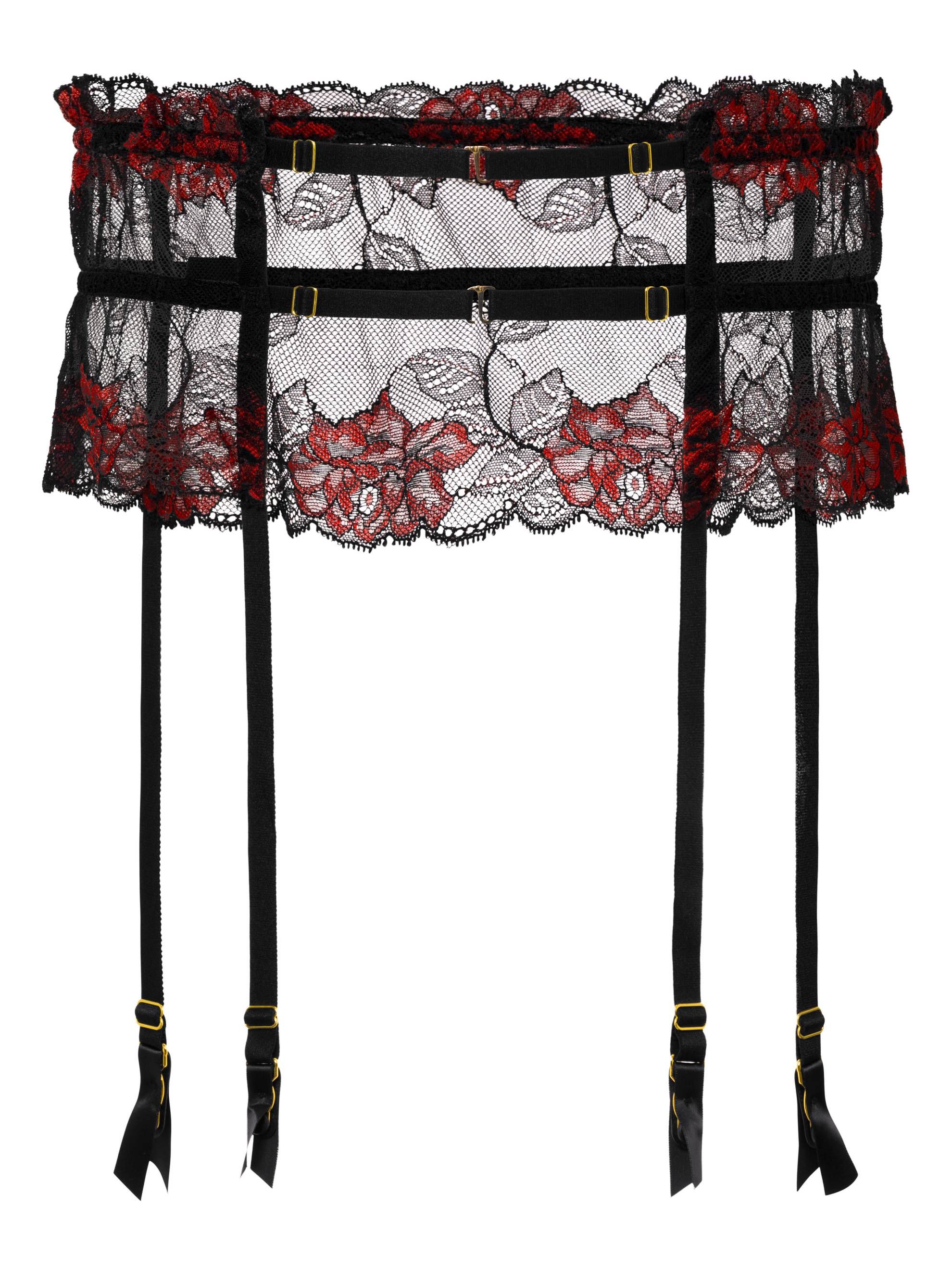 Garter belt made of elegant lace in a sensual motif of red roses. Adjustable length of straps and fastenings.