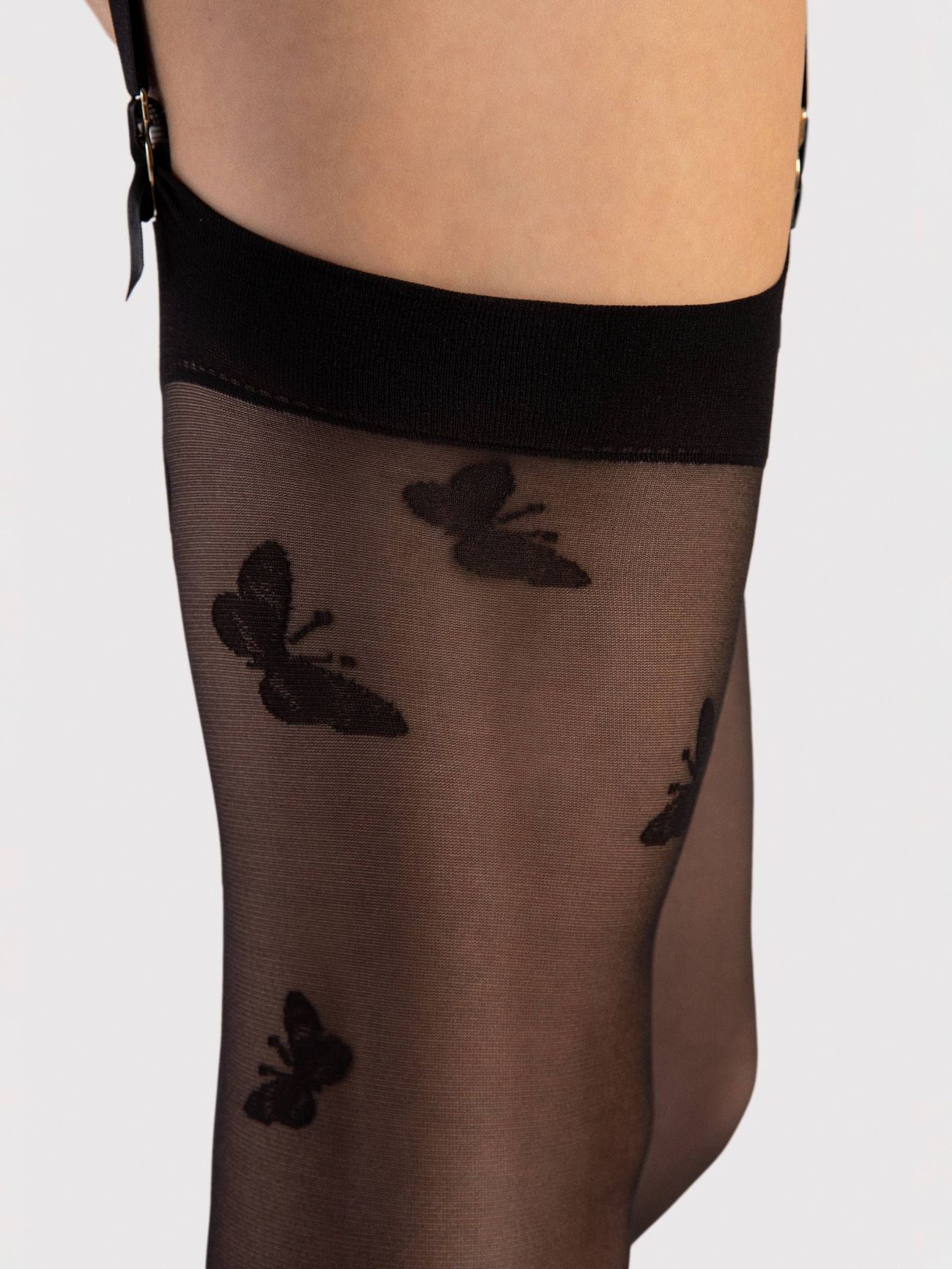 Ethereal garter stockings with a delicate butterfly motif. The butterfly symbolises transformation and rebirth, but also happiness and love! Add to that the quality of the comfortable, thin, semi-matte fabric, and the recipe for perfect stockings is complete.