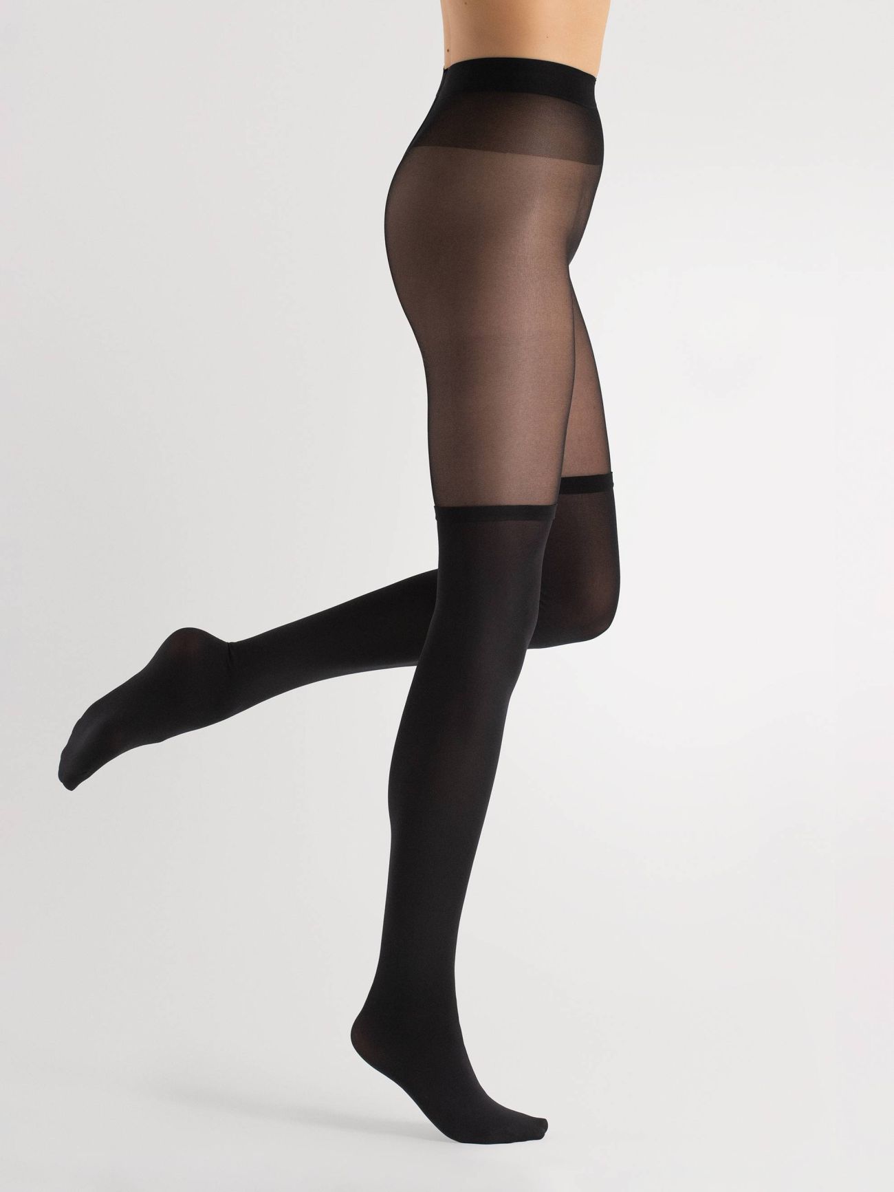 Sexy tights with a hold-up imitation pattern. Invisibly reinforced toe portion, comfortable flat seams and single-covered elastane yarn for improved durability.