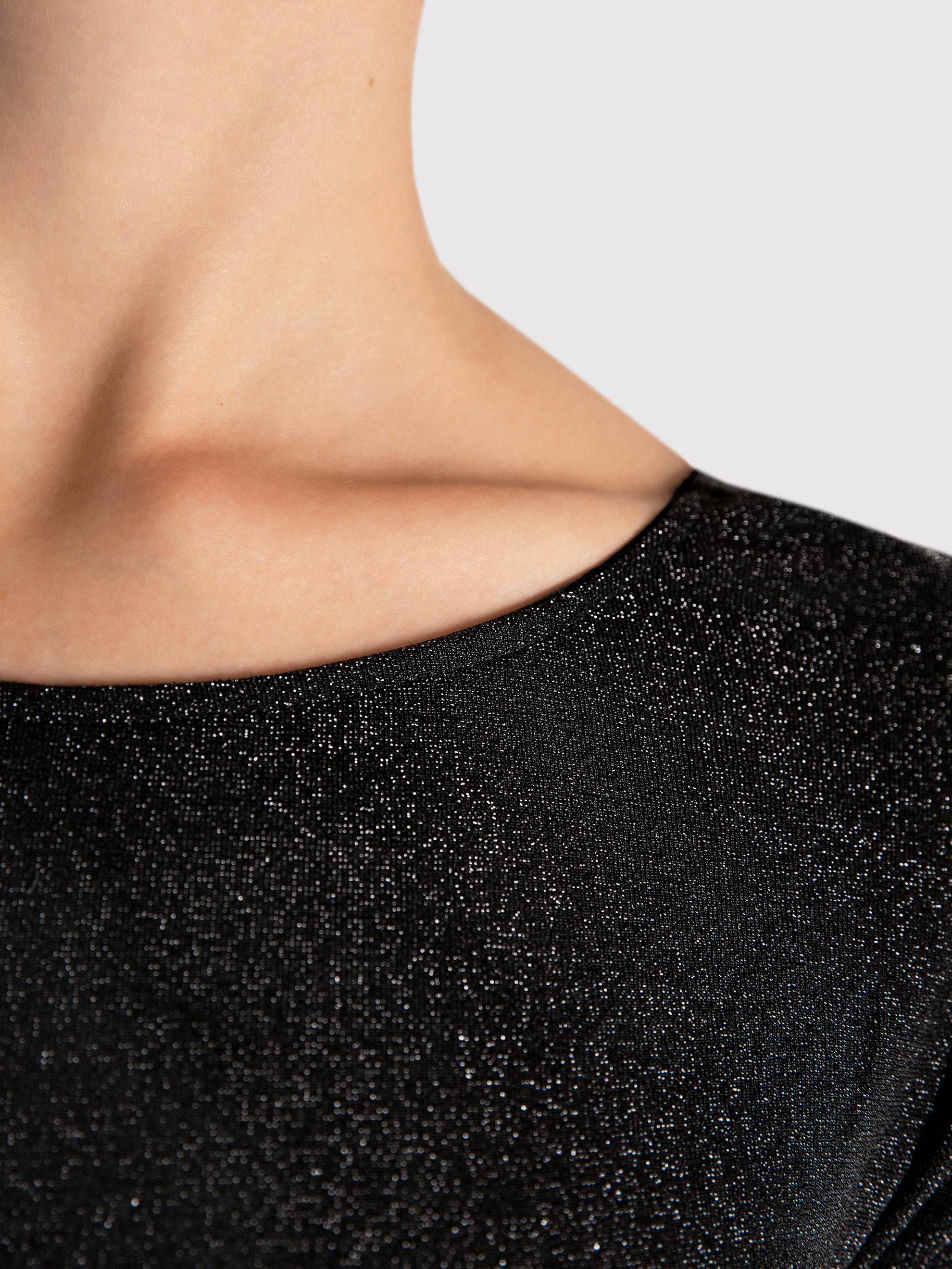 Eleganckie i elastyczne body z długimi rękawami i uwodzicielskim dekoltem na plecach. Miękka od środka i lśniąca na zewnątrz dzianina dopasuje się do Twojej sylwetki i sprawi, że będziesz błyszczeć na niejednej imprezie, jak i na co dzień, gdy połączysz body np. z prostą marynarką. Model występuje w dwóch wersjach kolorystycznych z błyskiem: czarnej i miedzianej.