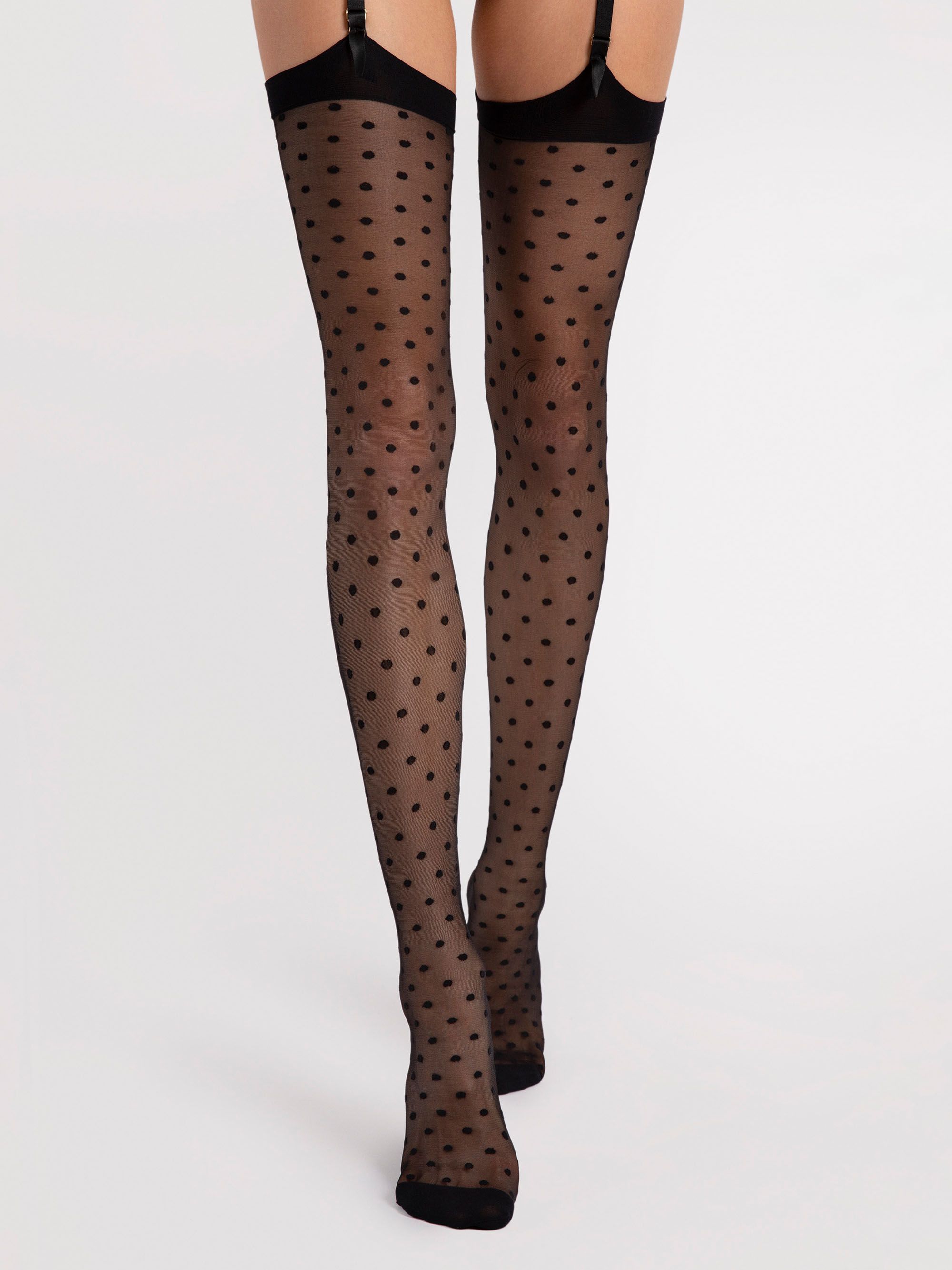 Kropki są retro oraz zawsze na czasie i kropka. Magia dzieje się, gdy przenosimy je na zmysłowe pończochy. Ubierając rano ten codzienny wzór, możesz go wieczorem zdjąć w najbardziej niecodzienny sposób.