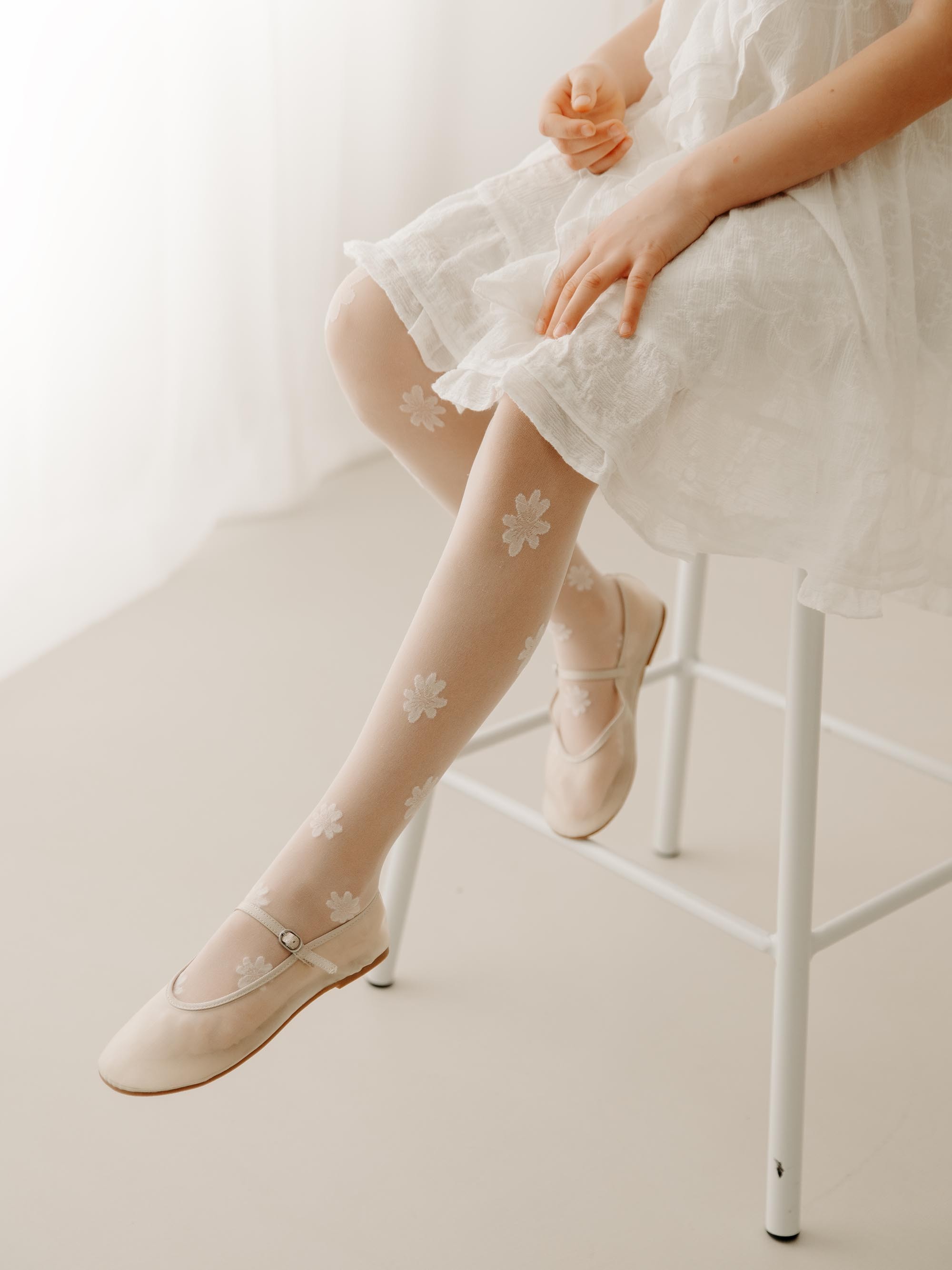 Rajstopy w dekoracyjny wzór kwiatów średniej wielkości na pastelowym, cielistym tle.