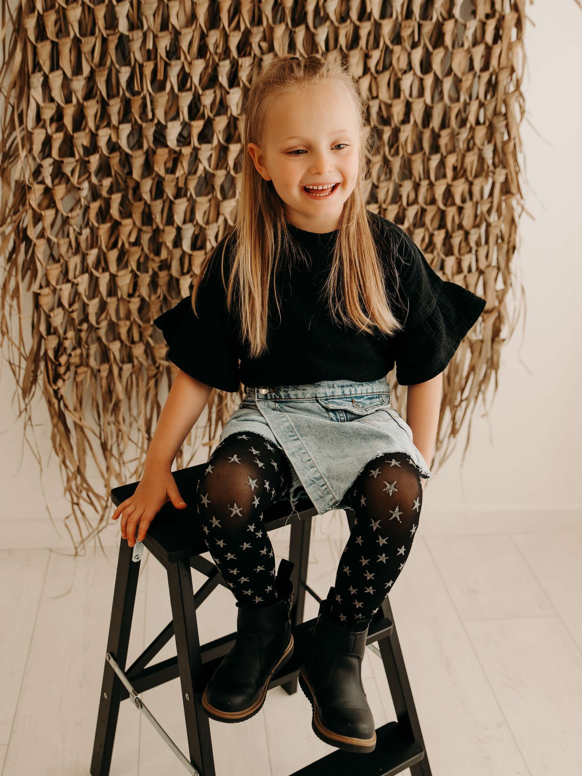 Te rajstopy to istna konstelacja stylu młodej fashionistki. Wzór jasnych gwiazdek na czarnym tle migocze jak odległe galaktyki w ciemną noc, dodając każdej dziewczynce niebiańskiej wprost elegancji i gracji.