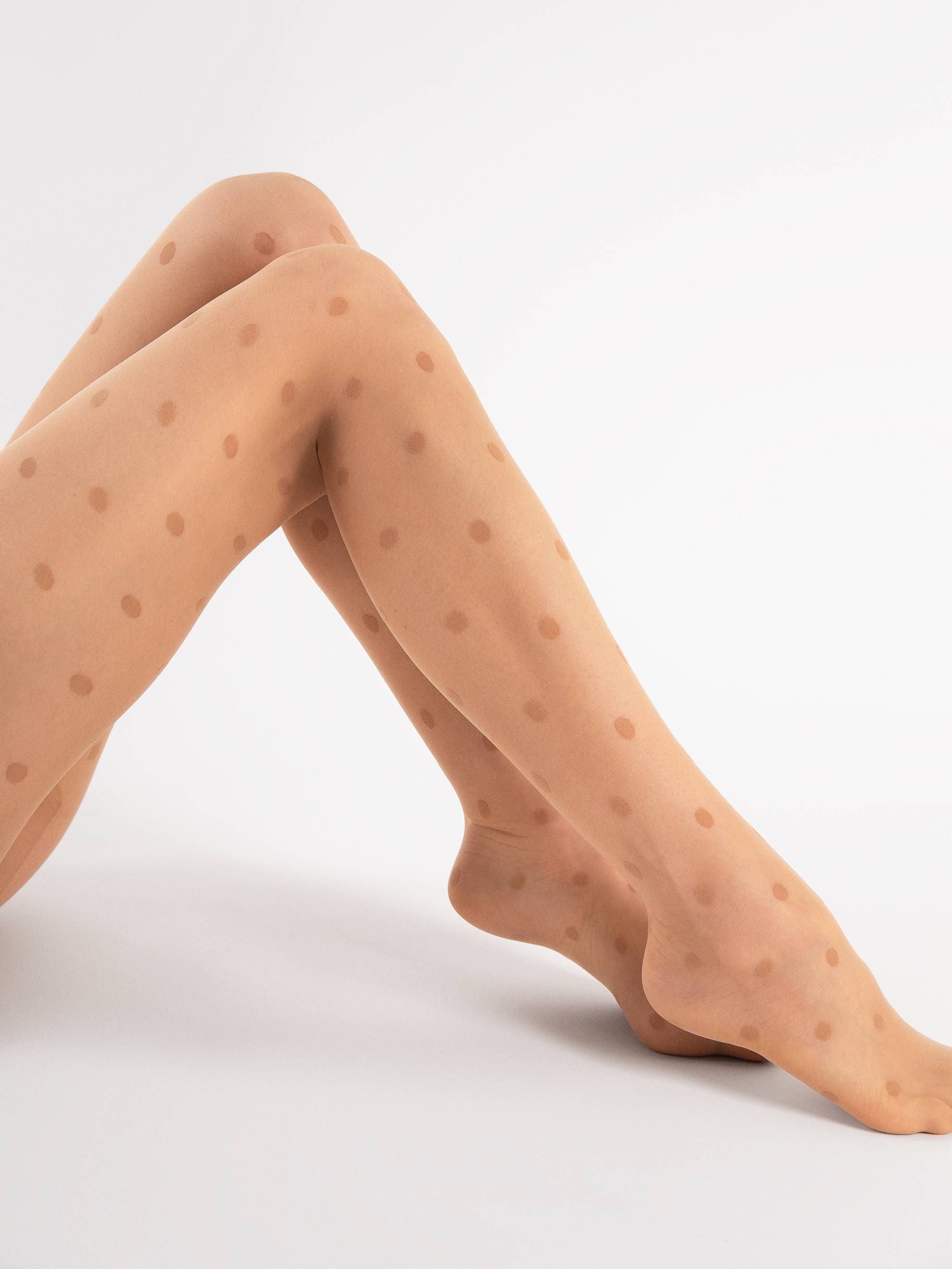 Stylowe rajstopy w grochy będą się świetnie prezentowały w połączeniu z ubraniami nawiązującymi krojem do lat 80., do sylwetki z poszerzonymi ramionami i rękawami bufkami.