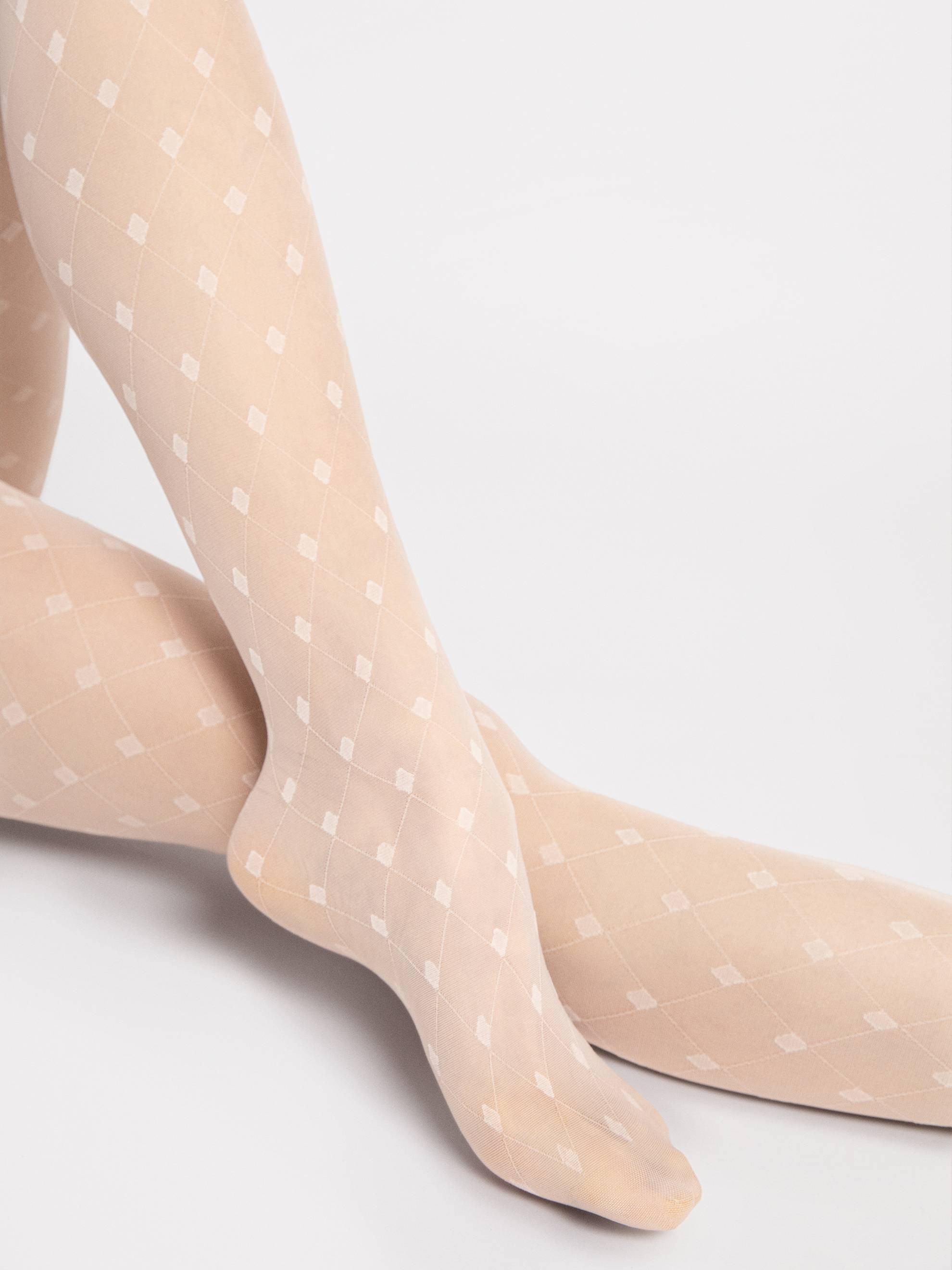 Eleganckie rajstopy w punktowy motyw drobnych rombów rozmieszczonych regularnie na wzorze przypominającym kabaretki z dużymi oczkami. Matowe rajstopy z motywem w stylu vintage.